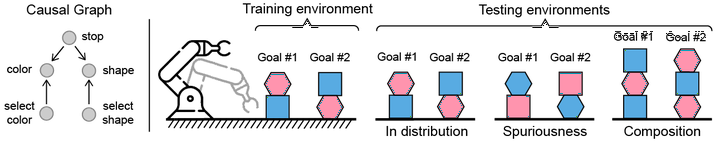 Diagram of proposed GRADER.As a pivotal component to attaining generalizable solutions in human intelligence, reasoning provides great potential for reinforcement learning (RL) agents’ generalization towards varied goals by summarizing part-to-whole arguments and discovering cause-and-effect relations. However, how to discover and represent causalities remains a huge gap that hinders the development of causal RL. In this paper, we augment Goal-Conditioned RL (GCRL) with Causal Graph (CG), a structure built upon the relation between objects and events. We novelly formulate the GCRL problem into variational likelihood maximization with CG as latent variables. To optimize the derived objective, we propose a framework with theoretical performance guarantees that alternates between two steps, i.e. using interventional data to estimate the posterior of CG; using CG to learn generalizable models and interpretable policies. Due to the lack of public benchmarks that verify generalization capability under reasoning, we design nine tasks and then empirically show the effectiveness of the proposed method against five baselines on these tasks. Further theoretical analysis shows that our performance improvement is attributed to the virtuous cycle of causal discovery, transition modeling, and policy training, which aligns with the experimental evidence in extensive ablation studies.