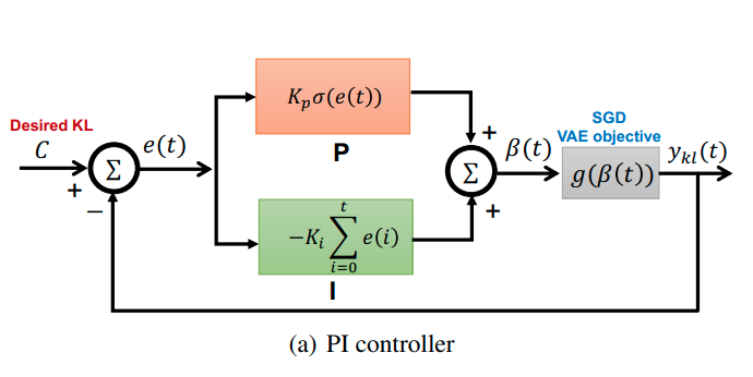 PID Controller for hyper parameter β: A diagram viewThe Controllable Variational Autoencoder (ControlVAE) combines automatic control theory with the basic VAE model to manipulate the KL-divergence for overcoming posterior collapse and learning disentangled representations. It has shown success in a variety of applications, such as image generation, disentangled representation learning, and language modeling. However, when it comes to disentangled representation learning, ControlVAE does not delve into the rationale behind it. The goal of this paper is to develop a deeper understanding of ControlVAE in learning disentangled representations, including the choice of a desired KL-divergence (i.e, set point), and its stability during training. We first fundamentally explain its ability to disentangle latent variables from an information bottleneck perspective. We show that KL-divergence is an upper bound of the variational information bottleneck. By controlling the KL-divergence gradually from a small value to a target value, ControlVAE can disentangle the latent factors one by one. Based on this finding, we propose a new DynamicVAE that leverages a modified incremental PI (proportionalintegral) controller, a variant of the proportional-integralderivative (PID) algorithm, and employs a moving average as well as a hybrid annealing method to evolve the value of KL-divergence smoothly in a tightly controlled fashion. In addition, we analytically derive a lower bound of the set point for disentangling. We then theoretically prove the stability of the proposed approach. Evaluation results on multiple benchmark datasets demonstrate that DynamicVAE achieves a good trade-off between the disentanglement and reconstruction quality. We also discover that it can separate disentangled representation learning and reconstruction via manipulating the desired KL-divergence.
